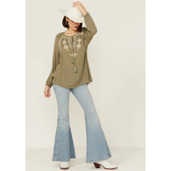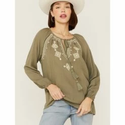 Budget β Miss Me π© Women’s Olive Embroidered Southwestern Tassel Top β